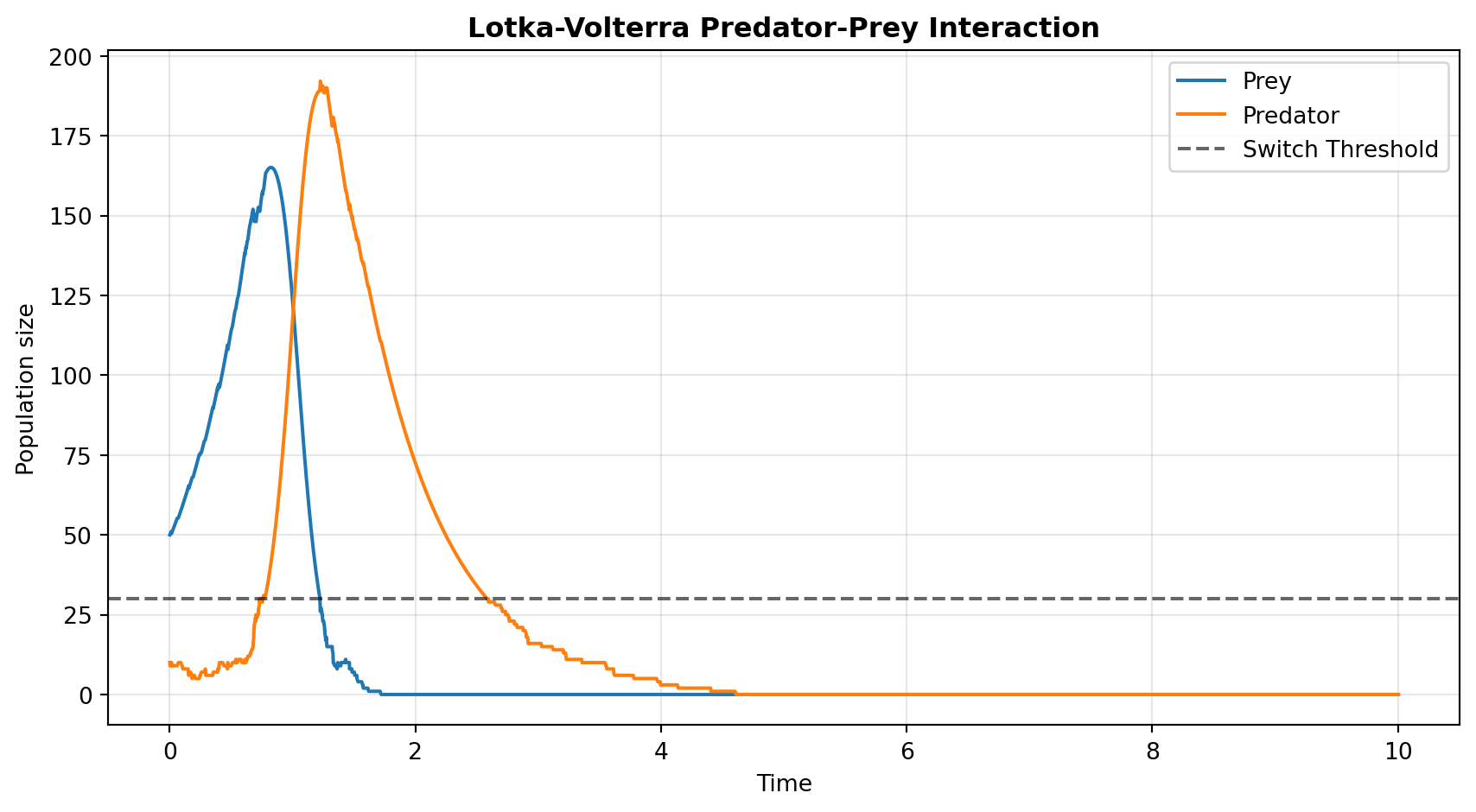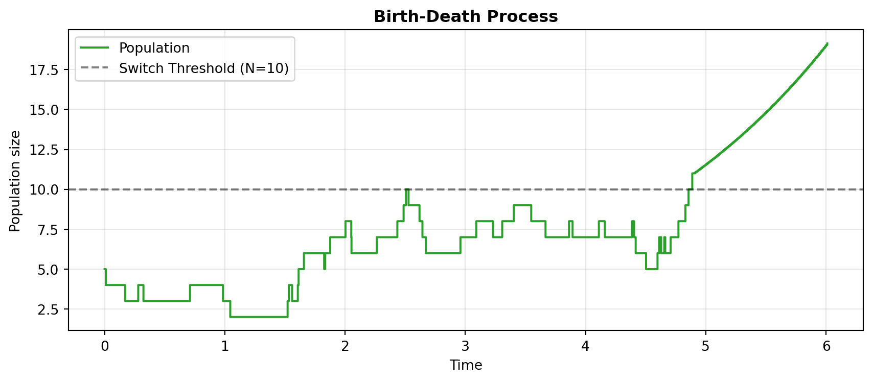 - Birth-Death: Demonstrates the fundamental ability of the algorithm to switch a single compartment’s simulation regime based on a single threshold.